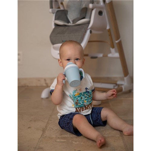 Kubek treningowy ma pojemność 250 ml. Jest to kubek do nauki samodzielnego picia z miękką silikonową słomką i systemem niekapiącym. Słomka jest całkowicie zdejmowana dla łatwego czyszczenia i zachowania idealnej higieny. Po przekręceniu górnej części kubka pokrywka zakrywa słomkę, blokuje się i jest szczelna. Dwa uchwyty na bokach sprawiają, że kubek jest łatwy do przenoszenia i utrzymania w małych rączkach.