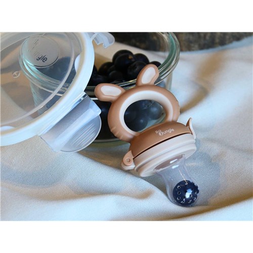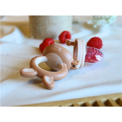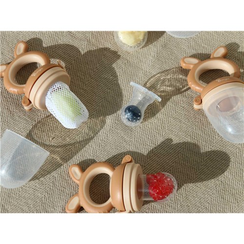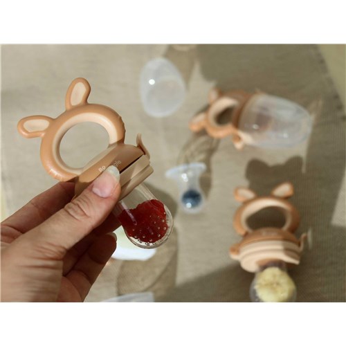 Smoczek 4w1 do podawania owoców jest wykonany z bezpiecznego, nietoksycznego silikonu i pozwala małym dzieciom nauczyć się samodzielnego jedzenia, a jego kształt i budowa pełni także funkcję gryzaka. Ergonomiczny uchwyt jest łatwy do trzymania dla małych rączek. W zestawie są aż 3 różne smoczki i siatka do owoców. Korzystając z nich minimalizuje się ryzyko zakrztuszenia, gdy dziecko uczy się połykać pokarmy stałe, zwłaszcza owoce. Wystarczy pokroić warzywa i/lub owoce na małe kawałki i umieść je w odpowiednim smoczku lub siatce. W ten sposób dziecko odkryje nowe smaki bez zadławienia się. Poza tym wykorzystując schłodzone owoce podajnik świetnie sprawdzi się podczas ząbkowania. Dzięki poręcznej pokrywce/nasadce można go wygodnie przechowywać, a silikonowa końcówka utrzymana jest w czystości.