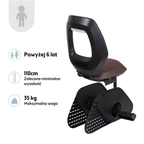 Bobike One Junior można łatwo zamontować do bagażnika roweru. Mocowanie pasuje do bagażników o szerokości 120 - 175 mm (4,72 - 6,89"), które mogą przewozić do 38 kg. Rury zewnętrzne muszą być okrągłe i mieć średnicę między 10 - 16 mm. Odpowiedni dla rowerów elektrycznych do max. 25 km/h.