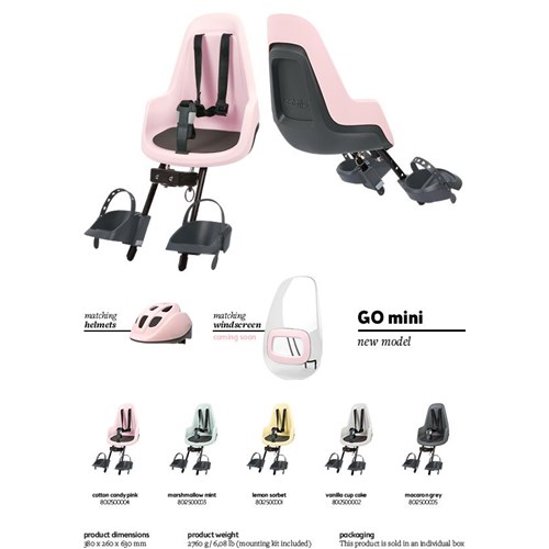Przedni fotelik przeznaczony dla dzieci w wieku od około 9 miesięcy do 3 lat lub o masie ciała do 15 kg. Bobike GO mini posiada w komplecie z uchwyt montażowy do węższych i szerszych rurek sterowych (Ø 22-28 mm i rurek sterowych MTB: 1-1 / 8").