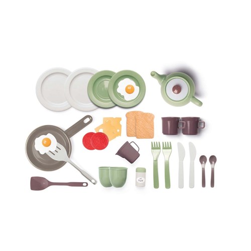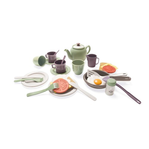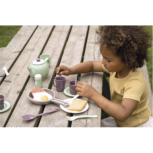 Z tym pięknym zestawem śniadaniowym możesz zaprosić rodzinę, lalki i misie na duże, pyszne śniadanie. W skład zestawu wchodzą między innymi: tosty, plasterki sera i pomidora, jajka i patelnia do ich przygotowania, sól i zastawa śniadaniowa składająca się z dzbanka do herbaty, talerzyków, sztuców, kubeczków i podstawek. Zestaw śniadaniowy wspiera zarówno wyobraźnię, jak i zdolności motoryczne dziecka podczas przygotowywania i podawania śniadania. Ten zestaw nadaje się do zabawy w domu i na zewnątrz. Można skompletować kilka zestawów tej serii, które wspierają zabawę na świeżym powietrzu, naukę i odkrywanie.
