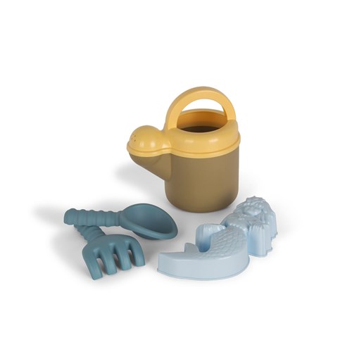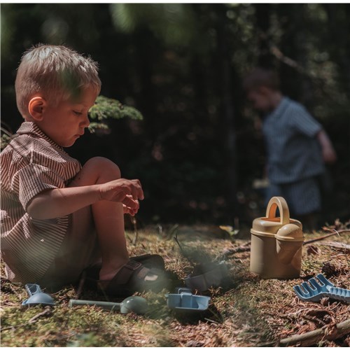 Uroczy zestaw z konewką/dzbankiem na wodę, foremką do piasku, łopatką i grabkami. Zestaw jest idealny do zabawy i nauki na plaży lub w piaskownicy, dla młodszych i starszych. Zabawa z piaskiem i wodą wzmacnia eksplorację sensoryczną dziecka, a także drobną motorykę, na przykład podczas napełniania i obracania foremki do piasku. Zestaw jest w stonowanych, naturalnych kolorach i gwarantuje godziny zabawy malucha i zapewnia wiele okazji do sensorycznej eksploracji na świeżym powietrzu za pomocą piasku i wody, stymuląc zdolności motoryczne i zmysły dziecka.