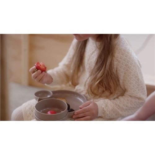 Zestaw składa się z 6-ciu elementów: talerzyka z 3 komorami, miseczki, poręcznego kubka niekapka i kompletu sztućców: łyżeczki, widelca i noża. Miseczkę i kubek można umieścić na głównym talerzu tak, że pozostają nieruchome, pomagając tym samym maluchom opanować umiejętność samodzielnego spożywania posiłku. Trzy przegródki na talerzu pozwalają posortować jedzenie i dać dziecku łatwy do opanowania posiłek. Wszystkie naczynia posiadają zaokrąglone wewnętrzne krawędzie, które ułatwiają dziecku samodzielne nabieranie jedzenia. Naczynia są matowe na zewnątrz i satynowo gładkie od środka. Lekki i poręczny kubek idealnie sprawdzi się do nauki picia, jego nieduży rozmiar jest dopasowany do małej rączki dziecka. Poręczna łyżeczka ułatwia maluchowi jej stabilne utrzymanie w pierwszym okresie samodzielnego jedzenia lub karmienia, a cały komplet sztućców będzie niezwykle pomocny na dalszym etapie. Zestaw naczyń może towarzyszyć dzieciom już od pierwszego posiłku i dostosowywać się do ich rosnącej sprawności i rozwoju umiejętności motorycznych. Polecamy połączyć komplet obiadowy z innymi elementami z serii, aby uzyskać ekscytującą mieszankę kolorów i dodatkowe elementy do wykorzystania w razie potrzeby.