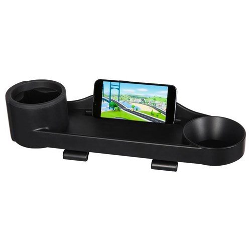 Przemyślany układ przegródek – miejsce na jedzenie, napoje, akcesoria i zabawki i podpórka pod telefon.
