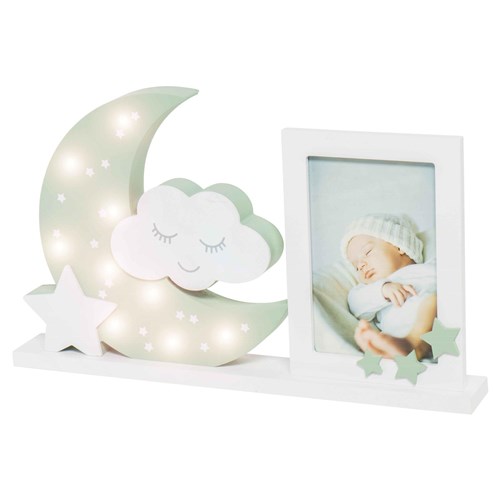 Ta ramka składa się z uroczego księżyca, słodkiej chmurki z buzią i małej gwiazdki. Ramka mieści zdjęcie o wymiarach 10 x15 cm. Szczególną cechą tej ramki jest to, że księżyc wyposażony jest w 9 małych lampek LED, dzięki czemu gwiazdki naprawdę świecą wokół zdjęcia dziecka. W ten sposób mamy rodzaj lampy, która roztacza bajkowe światło w pokoju dziecka lub w salonie i tworzy niesamowity efekt.