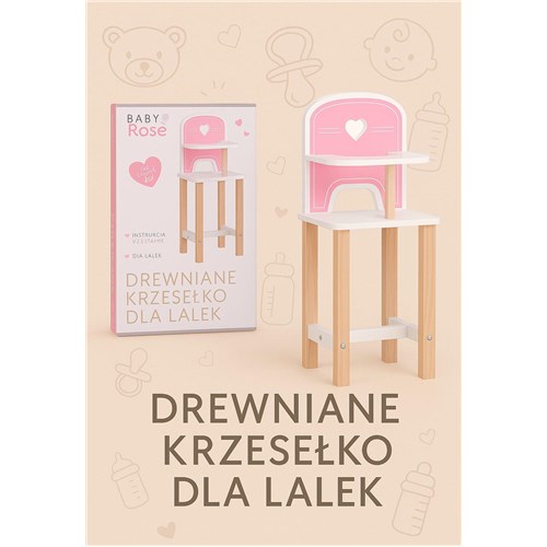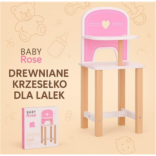 Urocze drewniane krzesełko dla lalek Baby Rose to idealny dodatek do zabawy w dom i karmienie ukochanych lalek. Wykonane z wysokiej jakości drewna, łączy bezpieczeństwo, trwałość i estetykę - w pięknym, dziewczęcym odcieniu różu. Krzesełko zachwyca prostym, klasycznym designem z serduszkiem w oparciu i naturalnymi drewnianymi nogami. Dzięki stabilnej konstrukcji jest wygodne i bezpieczne dla małych rączek. Doskonale pasuje do pozostałych mebelków z serii Baby Rose, tworząc spójny zestaw dla lalek. Można dokupić kołyskę dla lalek.