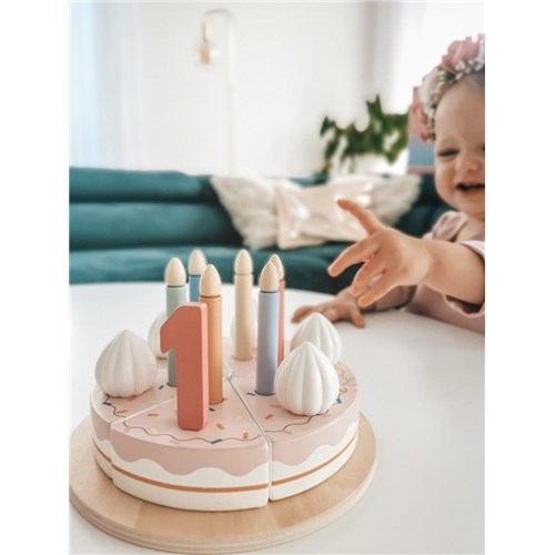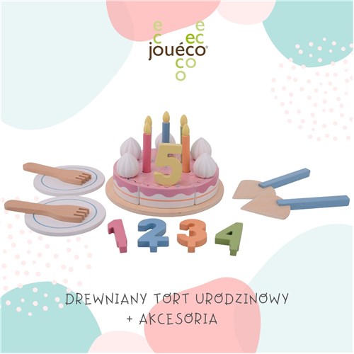 Drewniany pastelowy tort urodzinowy JOUECO to doskonały pomysł na zabawę w przyjmowanie gości i wspólne świętowanie – w tej zabawie mogą wziąć udział dzieci, rodzice a także ulubione lalki i misie – każdy chętnie celebruje urodziny! Podczas zabawy dziecko rozwija wyobraźnię oraz kształtuje umiejętności społeczne. W zestawie znajduje się tort z 6 kawałków, talerz do podawania toru, 2 małe talerzyki i widelce, 2 łopatki do tortu, 5 świeczek klasycznych i 5 świeczek cyferek oraz słodkości do udekorowania tortu. Kawałki tortu oraz elementy do udekorowania tortu są połączone ze sobą narzepy, dzięki czemu dobrze trzymają się.