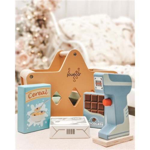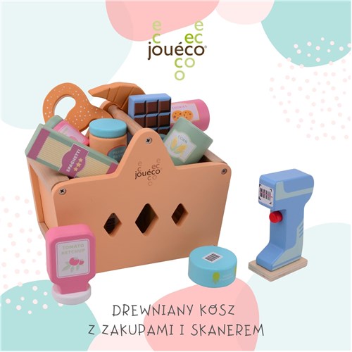 Drewniany kosz z zakupami i skanerem JOUECO jest wyjątkowo szykowny i idelany do zabawy w zakupy w supermarkecie, na cotygodniowym targu oraz można go wykorzystać na pikniku z przyjaciółmi. Dzięki wielu akcesoriom maluchy mogą przyjmować w zabawie różne role i wzmocnić swoje zdolności motoryczne i komunikacyjne. Koszyk + akcesoria mogą być używane oddzielnie lub jako dodatek do kuchni lub sklepu. Drewniany kosz posiada uchwyt do przenoszenia i wypełoniony jest po brzegi smakołykami typu rogal, ciastka,czekolada, kukurydza, ketchup, dżem i inne, a dzięku skanerowi zabawa w sklep jest doskonała!