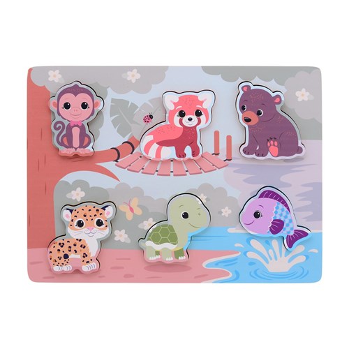 Drewniane puzzle The Wildies Family od JOUECO toidealna zabawka dla malucha. Każde dziecko uwielbia taką zabawę, chwytać, wkładać elementy, aby odkryć niespodziankę pod spodem, zrozumieć ich kształty iwłaściwości. Puzzle są stworzone dla małych rączek, łatwe do chwytania. Składają się z 6-ciu zwierzaków-przyjaciół z dżungli i pod każdym z nich można odkryć szczegóły typu rybia łuska u ryby, miękkie futerko tygryska, skorupa żółwika. Ta dotykowa układanka stanowi świetną zabawkę edukacyjną, poprawia zdolności motoryczne i pobudza ciekawość poprzez zabawę sensoryczną, uczy koncentracji i stymuluje koordynację wzrokowo-ruchową