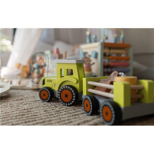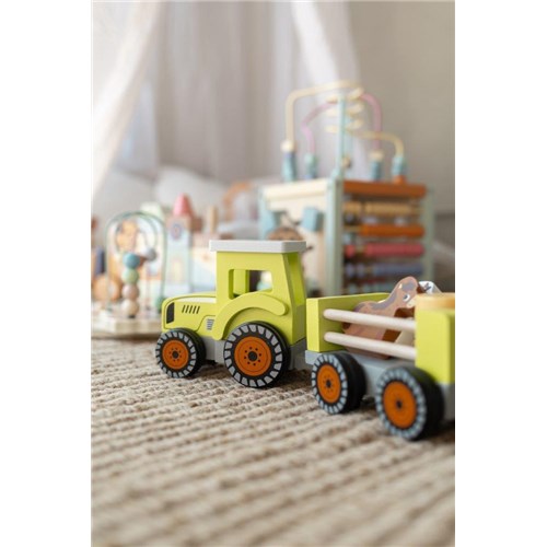 Zielony taktor z przyczepą i zwierzętami JOUECO to świetna zabawka dla dzieci od 18 m-ca życia. To idealna zabawka pobudzająca wyobraźnię malucha i rozwój motoryczny. W odpinanej przyczepie znajdują się zwierząta:krówka i konik oraz duża beczka z mlekiem. Maluch ma zadanie, aby to wszystko przetransportować. Zabawka zagwarantuje dziecku fantastyczny czas i wielemożliwości zabawy. Stanowi świetny pomysł na prezent.