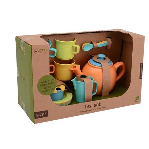 BIO zestaw do herbaty Tea set od Joueco wykonanany jest z BIOplastiku w najnowszej technologii z recyklingu słomy pszennej.Wspaniały zestaw z niebieskim dzbankiem, cukierniczką, pojemnikiem na śmietankę lub sok i całą zastawą w stonowanych, naturalnych kolorach zawiera 4 pełnenakrycia dla 4 osób: talerzyki, filiżanki i łyżeczki. Zestaw idealnie nadaje się zarówno do zabawy w pomieszczeniu, jak i na zewnątrz. Gwarantuje godziny zabawy malucha i całej rodziny.