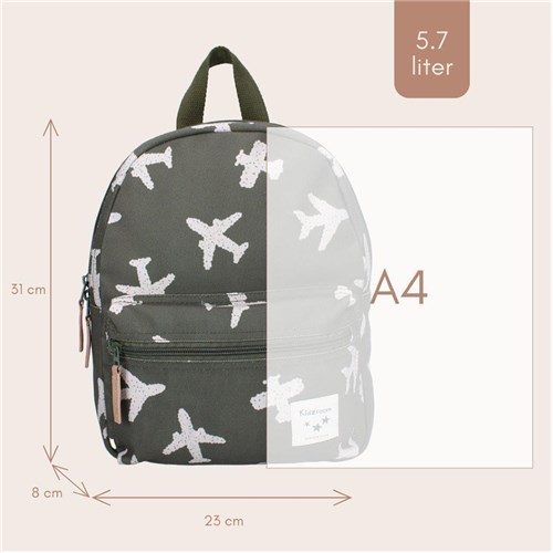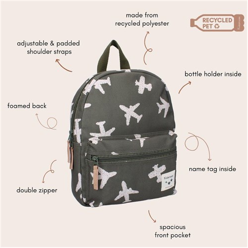 Czyż nie jest to uroczy plecak? Twoje dziecko będzie chciało go zabrać wszędzie. Starannie zaprojektowany, aby pasował do każdego stroju i tworzył dobry styl.Ten plecak w odcieniu army khaki z nutą szarości z kolekcji Adore More ma uroczy nadruk w samoloty i wykonany jest z miękkich materiałów jakie pochodzą z poliestru z recyklingu (rPET). Plecak ma poręczną przednią kieszeń z zamkiem błyskawicznym na mniejsze przedmioty. Duża komora główna ma poręczny podwójny zamek błyskawiczny i oferuje miejsce na pudełko na lunch lub dodatkowy zestaw ubrań. Poręczny, gdy dziecko zabiera plecak do przedszkola czy szkoły. Beżowe wykończenia z eko skórki przy zamkach są solidne, a uchwyt na górze pozwala zabrać plecak ze sobą lub go powiesić. Plecak posiada również regulowane i wyściełane paski na ramiona oraz wzmocniony tylny panel z wygodnej pianki dla dodatkowego komfortu noszenia. Plecak, z którego może być dumny!