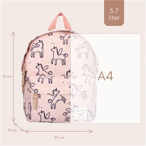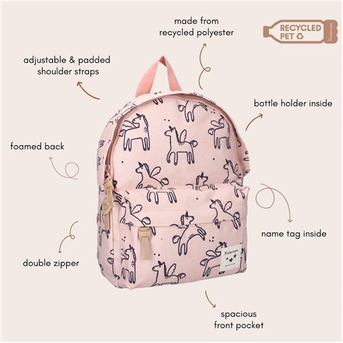 Plecak z jednorożcem holenderskiej marki Kidzroom na pewno pokocha mała księżniczka! Dzięki uroczym, wesołym jednorożcom na pastelowo różowym tle jest to idealna torba dla każdego dziecka i co ważne wykonana z miękkich materiałów jakie pochodzą z poliestru z recyklingu (rPET). Plecak ma poręczną przednią kieszeń z zamkiem błyskawicznym na mniejsze przedmioty. Duża komora główna ma poręczny podwójny zamek błyskawiczny i oferuje miejsce na pudełko na lunch lub dodatkowy zestaw ubrań. Poręczny, gdy dziecko zabiera plecak do przedszkola czy szkoły. Różowo-beżowe wykończenia z eko skórki przy zamkach są solidne, a uchwyt na górze pozwala zabrać plecak ze sobą lub go powiesić. Plecak posiada również regulowane i wyściełane paski na ramiona oraz wzmocniony tylny panel z wygodnej pianki dla dodatkowego komfortu noszenia, wewnątrz znajduje się metka z imieniem, aby każdy wiedział, do kogo należy. Plecak, z którego można być dumnym!