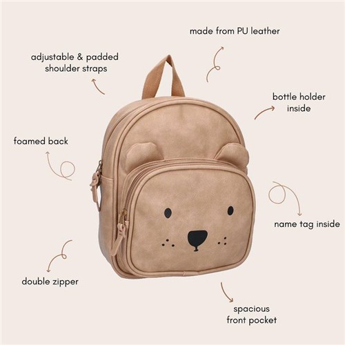 Słodki plecaczek na pierwsze wycieczki Twojego dziecka z kolekcji Beary Excited jest całkowicie trendy. Plecak ma piaskowy beżowy kolor i jest wykonany ze ekoskóry PU. Przednia kieszeń ma kształt misia, a nawet urocze uszy. Plecak jest idealny dla maluchów i starszaków do przedszkola, na wakacyjny wyjazd lub podczas nocowania u babci i dziadka. Plecak ma przestronną komorę główną, w której można umieścić przybory szkolne, lunch box i kubek do picia. Paski na ramię mają regulowaną długość, a górny uchwyt ułatwia zawieszenie. Plecak posiada również wyściełane paski na ramiona oraz wzmocniony tylny panel z wygodnej pianki dla dodatkowego komfortu noszenia.