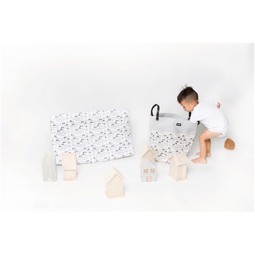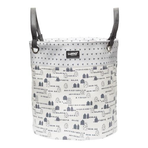 dzięki koszowi na zabawki LUMA w kolorze jasno szarym z motywem małych domów.