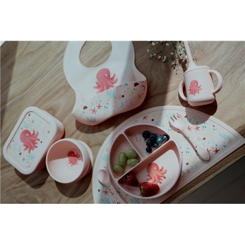 Skompletuj także inne silikonowe akcesoria z ośmiornicą dla maluszka: miskę, zestaw sztućców, kubek, matę/podkładkę, śliniaczek. A dla starszaka znajdziesz plecaki, torby terminczne, butelki i bidony, lunchboxy i inne akcesoria niezbędne już dla przedszkolaka.