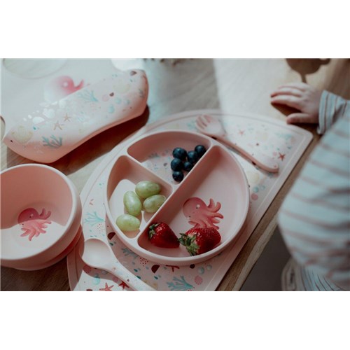 Talerzyk charakteryzuje się miękką i przyjemną w dotyku teksturą, a jego elastyczna, trwała konstrukcja jest odporna na uderzenia i codzienne dziecięce testy. Stabilna podstawa ssąca mocno trzyma się stołu, zapobiegając przesuwaniu się lub upadkowi naczynia – mniej bałaganu i więcej spokoju dla rodzica.