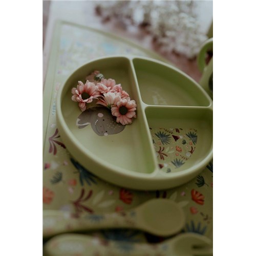 Talerzyk charakteryzuje się miękką i przyjemną w dotyku teksturą, a jego elastyczna, trwała konstrukcja jest odporna na uderzenia i codzienne dziecięce testy. Stabilna podstawa ssąca mocno trzyma się stołu, zapobiegając przesuwaniu się lub upadkowi naczynia – mniej bałaganu i więcej spokoju dla rodzica.