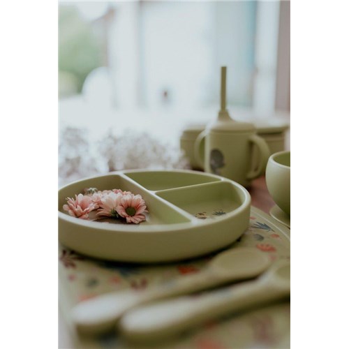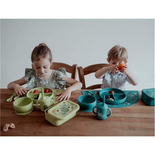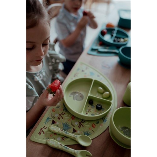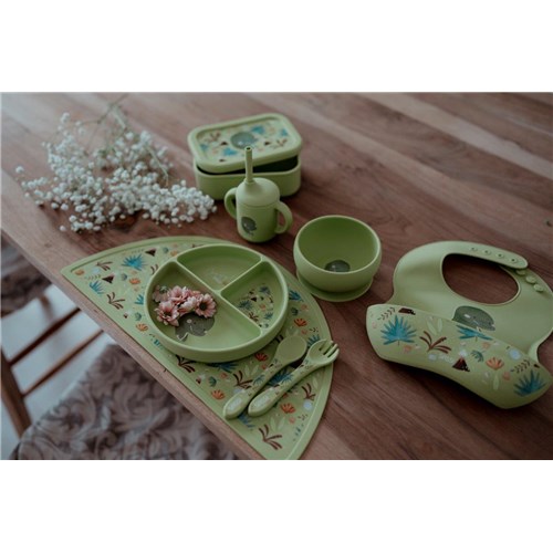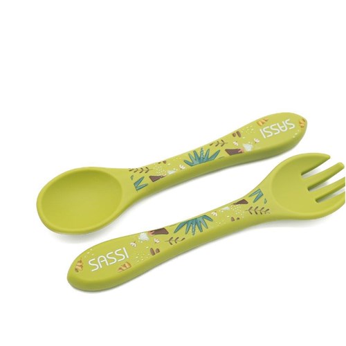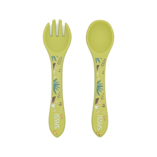 Wygodne i poręczne sztućce w kolorze jasnozielonym z printem, który ozdabia rączki łyżki i widelca, oraz pasuje do kolekcji z dinozaurem tej marki, zachęca dziecko do sięgania po kolejne kęsy i zamienia posiłek w radosną przygodę.