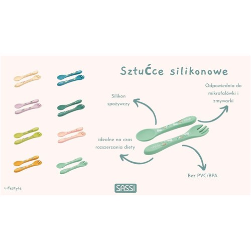 Sztućce SASSI to bezpieczny, estetyczny i funkcjonalny zestaw, który wspiera dziecko w nauce samodzielnego jedzenia od pierwszych dni rozszerzania diety.