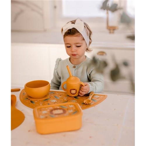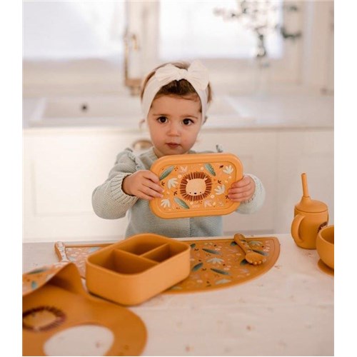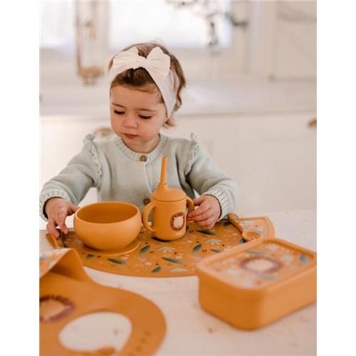 Mata w kolorze pomarańczowym z uroczym printem pasującym do linii produktów tej marki z lwem to nie tylko ozdoba – to także codzienny kompan dziecka podczas nauki samodzielnego jedzenia.