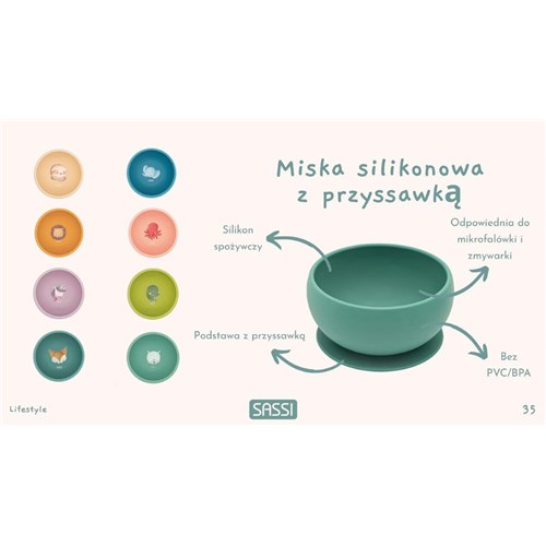 Miseczka SASSI to bezpieczny i funkcjonalny wybór, który wspiera dziecko w nauce samodzielnego jedzenia i ułatwia codzienne posiłki.