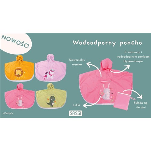 Stylowe i funkcjonalne ponczo przeciwdeszczowe włoskiej marki SASSI zadba o komfort i ochronę dziecka nawet w najbardziej deszczowe dni. Zaprojektowane specjalnie dla dzieci w wieku od 3 do 6 lat, poncho łączy w sobie wysoką jakość wykonania, lekkość oraz atrakcyjny design, który pokochają zarówno dzieci jak i rodzice. Wodoodporne poncho sprawdzi się idealnie na spacer, do przedszkola czy podczas rodzinnych wycieczek.