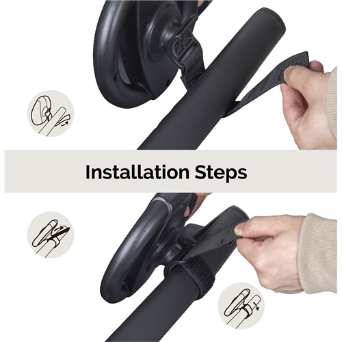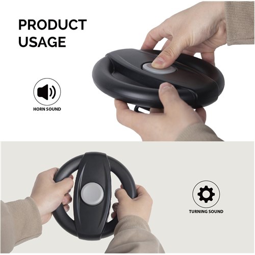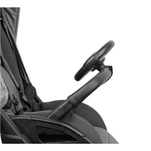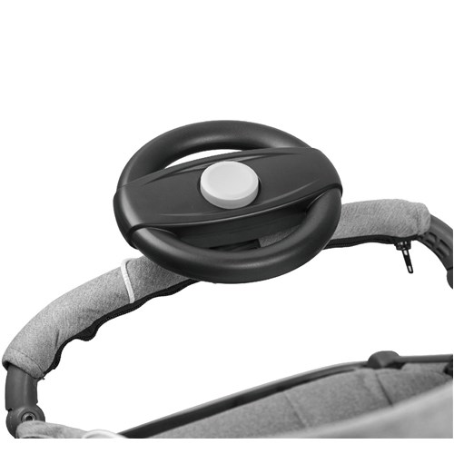 Kierownica jest czarna, estetycznie wykonana, wyposażona w jaśniejszy klakson, antypoślizgowa i profilowana tak, by była poręczna dla dziecięcych rączek. Na barierce sprawdzi się jako wesoła rozrywka dla małego pasażera, zamontowana na rączce może być atrakcją dla starszego rodzeństwa, np. jadącego na podstawce. Kierownica jest łatwa do utrzymania w czystości, wystarczy umyć ją wilgotną szmatką.
