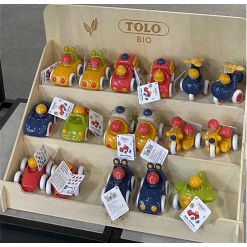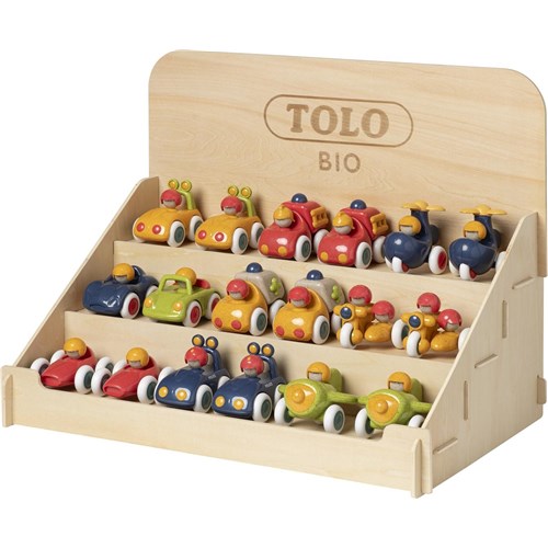 Drewniany ekspozytor TOLO BIO zawiera 20 różnych pojazdów Baby, w tym wyścigówki, samoloty, helikoptery, jeepy, motory, samochody sportowe, cabrio, samochody policyjne, wozy strażackie i karetki pogotowia – po 2 sztuki z modelu.