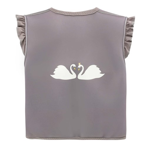 Neoprenowa kamizelka wypornościowa do pływania marki Vanilla Copenhagen dla dzieci w pięknym kolorze ciemno beżowym z delikatną falbanką na ramionach i cudownymi łabędziami królewskim na plecach, sprawdzi się idealnie podczas nauki pływania i zabawy, aby maluchy w kamizelce mogły pływać jak rybki w wodzie. Kamizelka zwiększa komfort i bezpieczeństwo dziecka w basenach, w parkach wodnych, nam morzem i są to podstawowe cele i elementy kolekcji kąpielowej Vanilla Copenhagen. Kamizelka posiada osiem wewnętrznych pływaków. Zapewniają one pływalność dostosowaną do rozmiaru, potrzeb i umiejętności pływackich dziecka. Wyporność można regulować, wyjmując pływaki z kieszeni wewnątrz kamizelki. Gdy dziecko znajdzie się na odpowiednim poziomie, będzie mogło z łatwością kontrolować swoją pływalność.