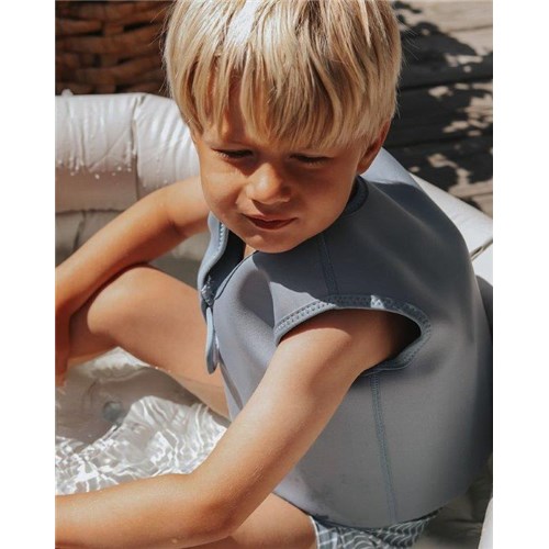 Kamizelka jest wykonana z miękkiego neoprenu 2 mm, z wytrzymałą warstwą nylonu po bokach, mocnymi szwami i mocnym zamkiem YKK oraz z zapięciem na rzep, aby dziecko nie mogło jej otworzyć. Kamizelka neoprenowa zwiększa komfort i bezpieczeństwo w wodzie oraz chroni przed słońcem (SPF 50+)