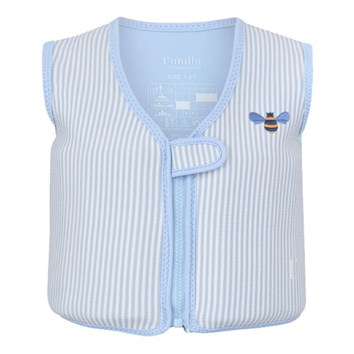 Neoprenowa kamizelka wypornościowa do pływania marki Vanilla Copenhagen dla dzieci w piękne błękitno białe paseczki z pszczółką z przodu, sprawdzi się idealnie podczas nauki pływania i zabawy, aby maluchy w kamizelce mogły pływać jak rybki w wodzie. Kamizelka zwiększa komfort i bezpieczeństwo dziecka w basenach, w parkach wodnych, nam morzem i są to podstawowe cele i elementy kolekcji kąpielowej Vanilla Copenhagen. Kamizelka posiada osiem wewnętrznych pływaków. Zapewniają one pływalność dostosowaną do rozmiaru, potrzeb i umiejętności pływackich dziecka. Wyporność można regulować, wyjmując pływaki z kieszeni wewnątrz kamizelki. Gdy dziecko znajdzie się na odpowiednim poziomie, będzie mogło z łatwością kontrolować swoją pływalność. Tkanina seersucker.