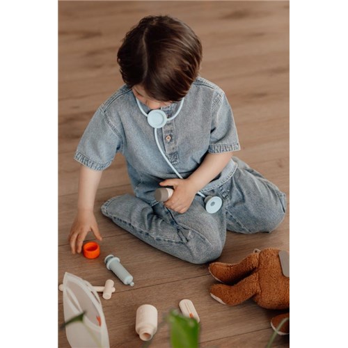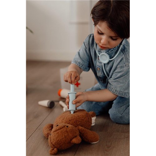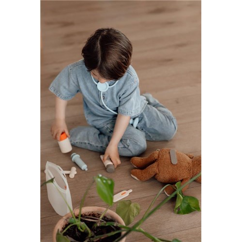 Pozwól swojemu maluchowi na rozwój wyobraźni dzięki uroczemu zestawowi lekarskiemu DOKTOR od Vanilla Copenhagen! Twoje dziecko nie tylko będzie się bawić, ale także rozwijać swoje umiejętności opiekuńcze i empatię, stając się małym "lekarzem". Zestaw to świetny sposób na edukacyjną zabawę, która przyciągnie maluchy na długie godziny! Elementy w zestawie w specjalnej lekarskiej torbie są wykonane z bezpiecznego i trwałego silikonu, a akcesoria lekarskie są idealne do zabawy w odgrywanie ról, oferując dzieciom edukacyjną rozrywkę, która pomoże im poznać podstawy opieki zdrowotnej. W zestawie: silikonowa torba, stetoskop, termometr, strzykawka, plasterek, młoteczek, tubka i buteczka ( jako lekarstwa).
