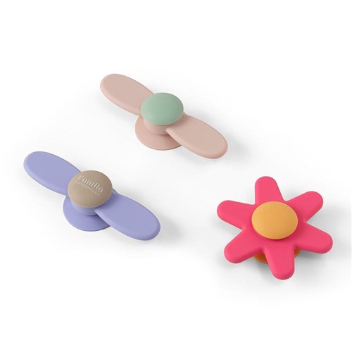 Zestaw składa się z trzech spinnerów z mocną przyssawką, które można łatwo przymocować do gładkich powierzchni – stolika, blatu kuchennego, krzesełka do karmienia, płytek w łazience czy wanny. Spinner obraca się przy lekkim dotknięciu, zachęcając dziecko do samodzielnej eksploracji i ćwiczenia precyzyjnych ruchów dłoni.